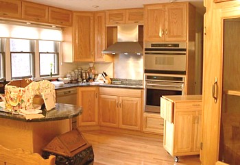 Country/traditional kitchen. Sliced white oak construction with raised panel doors. Custom pull-out pantry and mobile butcher block island. Natural finish.