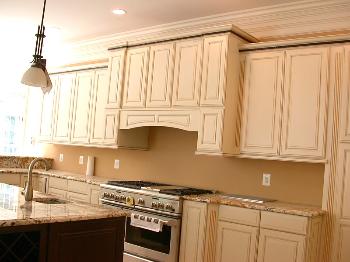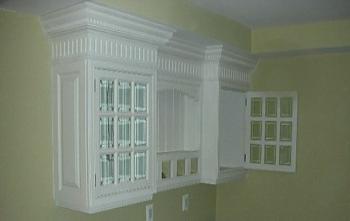 Sheffield kitchen with solid maple construction. White wash stain with inlaid crown molding. Lipped doors and drawers for knob-less appeal.