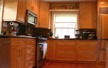 Shaker style cabinetry. Maple construction with toned lacquer finish. Custom built dish racks and spice drawer with matching fridge paneling.